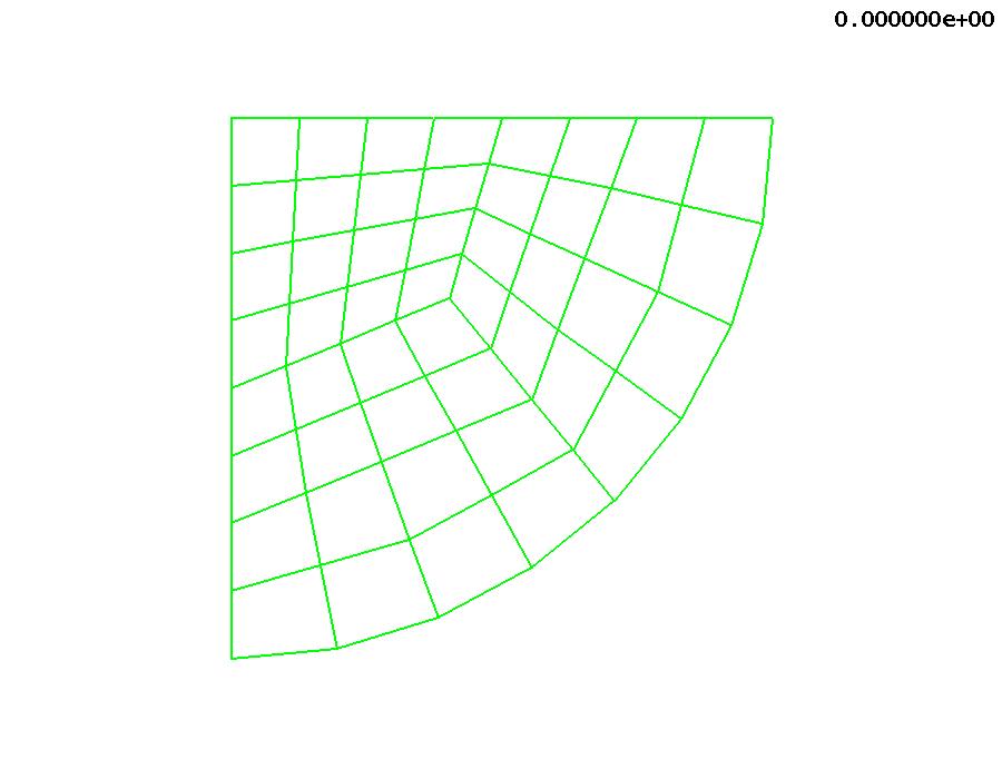 The first plot shows the initial mesh with quadrilateral elements. Because of symmetry, only a quarter of the total rubber cylinder is modeled. The upper edge is prescribed a downward displacement. Contact conditions are prescribed to model the rigid plate.