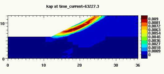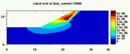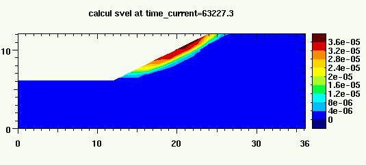 Now an extra loading on the slope is simulated, by imposing slowly a body force parallel to the slope. This body force might mimic a slope parallel force induced by groundwater flow after heavy raining. The extra force triggers instability of the slope. The instability analysis has been performed dynamically, so that mass terms lead to a more stable numerical convergence behavior. Furthermore, an automatic time stepping scheme is used, which reduces time steps when the instability shows up. The next two plots show the size of the velocity and the size of the plastic strains respectively.