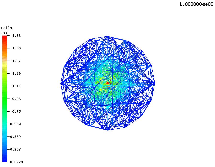 First a solution is determined on a coarse mesh, then a local mesh refinement is applied. The local mesh refinement automatically takes place at those places where the residue in the equation (the heat equation) is high, which is near the middle of the sphere.